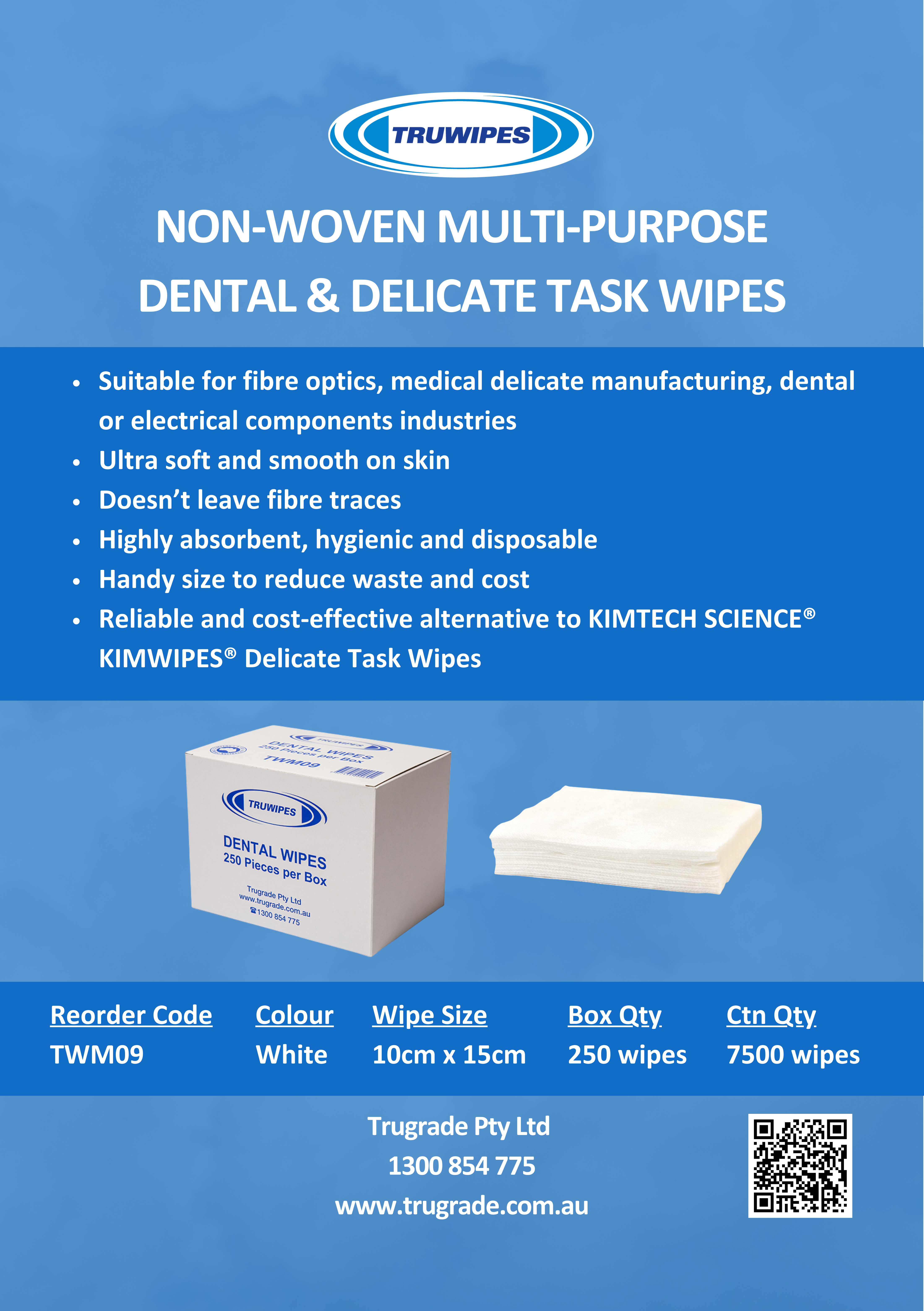Truwipe dental & delicate task wipes are non woven medium duty multi purpose wipes. aperture. Suitable for fibre optics, medical delicate manufacturing, dental or electrical components. Hygienic, ultra soft, highly absorbent, cost effective and leaves no traces of fibres.