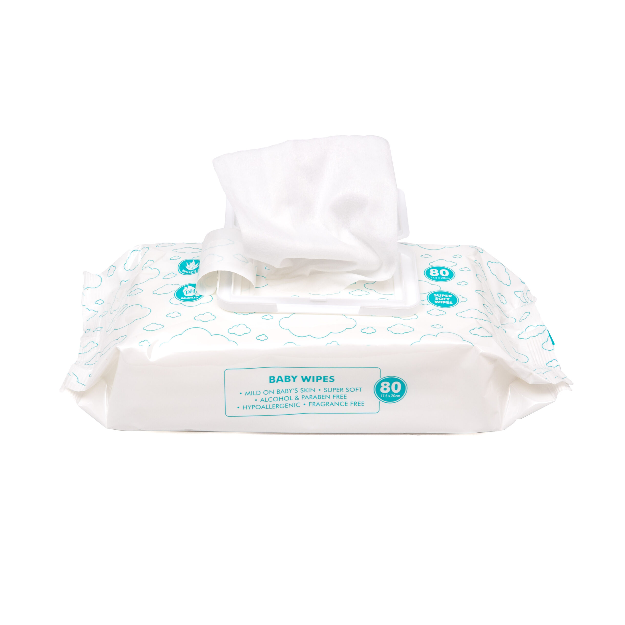 Soft, hygienic baby & body wipes, mild on skin, alcohol & paraben free, hypoallergenic, fragrance free.