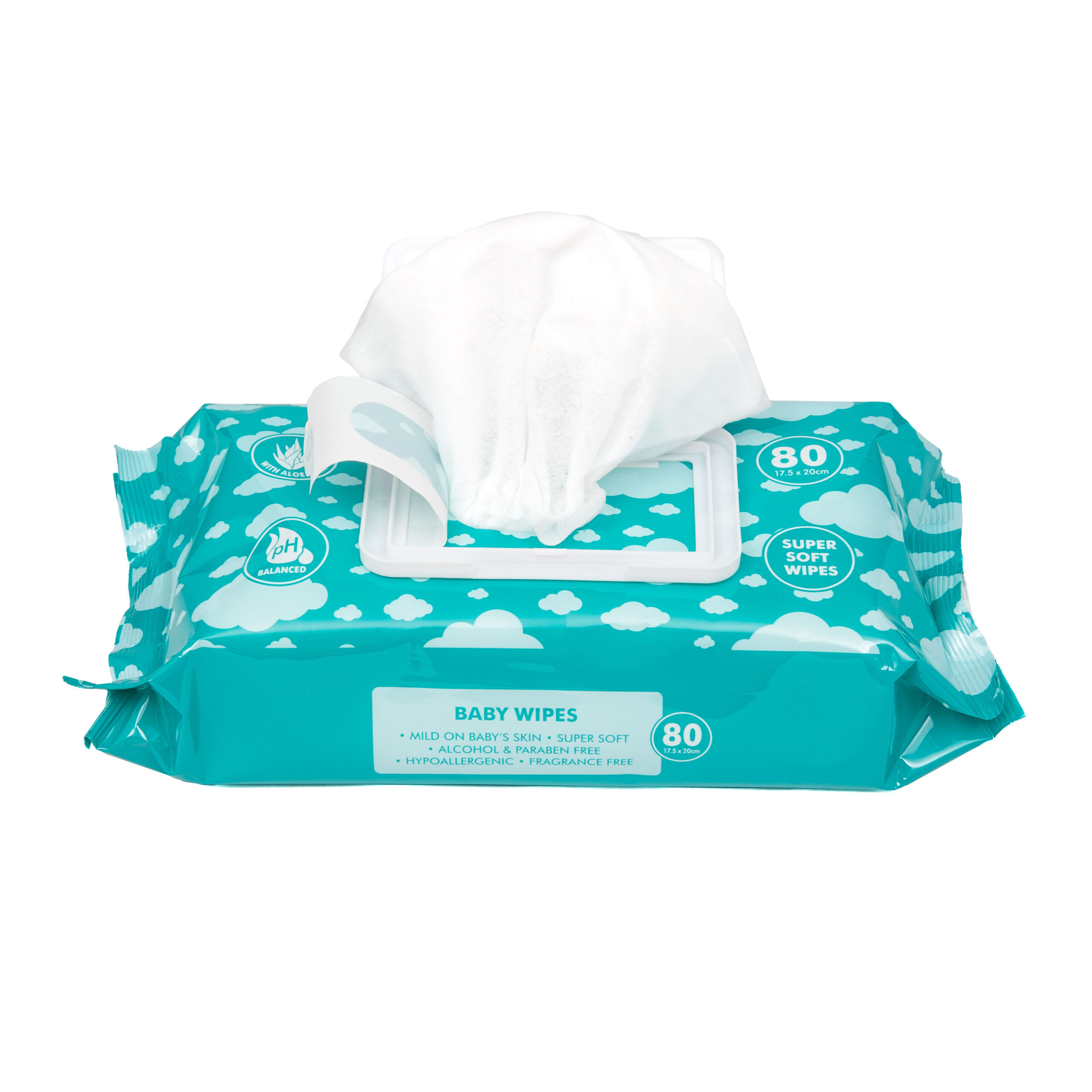 Soft, hygienic baby & body wipes, mild on skin, alcohol & paraben free, hypoallergenic, fragrance free with continuous draw.